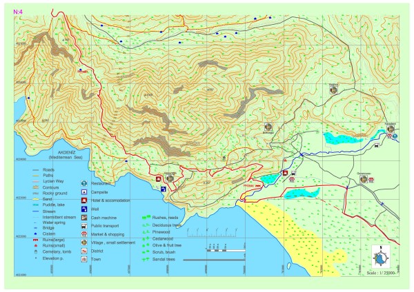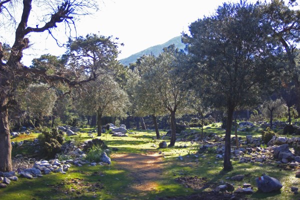 The Lycia road splits towards right after a couple of kilometers from the dirt road which splits towards southeast, on a flat area with its red soil, ancient olive trees, carstic limestone and plants indigenous to the Mediterranean seems just like a man made ornamental garden and elevates through high pine trees towards a channel after a region called Belcekız.